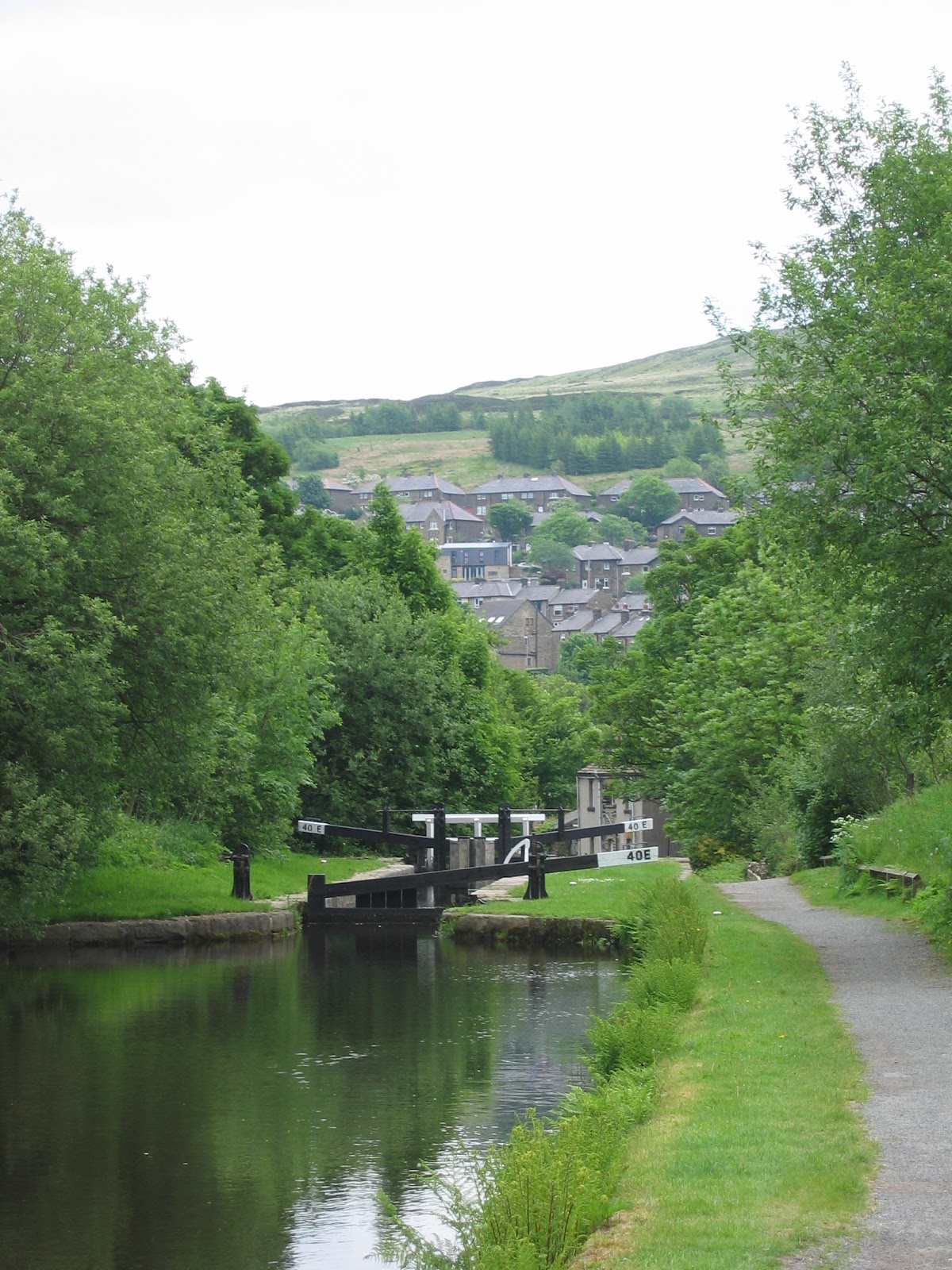 We had climbed up 32 locks from Ashton-under-Lyne on the western side. 42 more awaited us as we made our way down to Huddersfield, but we were in no hurry and started dawdling down the scenic Colne valley (here near Marsden).